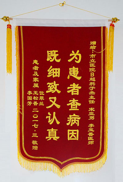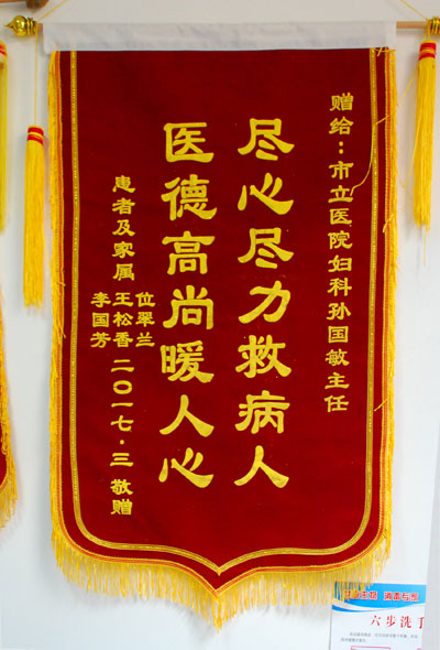 入院后,經完善相關輔助檢查,決定給患者實施宮腔引流。位大娘宮腔積膿太多,而且年紀大,子宮壁已經非常薄,在治療過程中風險系數(shù)高,治療難度大,如果引流時探查稍一用力,可能會造成子宮穿孔而導致盆腔感染,甚至會危及生命。孫國敏主任細心對家屬講解了位大娘的病情并講述了治療過程中存在的風險,經患者及家屬同意后,孫主任專家團隊實施引流術。經過孫主任細致的操作,引流出膿液共500ml,惡臭味充滿了走廊,治療成功,當聽到孫主任說治療成功時,年僅6歲的重孫帶著哭腔說:奶奶好了,奶奶好了!術后抗炎治療三天,孫主任密切關注位大娘的身體狀況并及時修改治療方案,位大娘陰道排液明顯減少,病情穩(wěn)定,位大娘恢復良好。三天后,孫主任給患者再次行宮腔引流,引流出膿液約100ml,一周后位大娘來我院復查B超,子宮已恢復到正常大小,宮腔無積膿,位大娘完全康復??祻秃螅淮竽锛覍賹⒁幻鎸懹?ldquo;盡心盡力救病人 醫(yī)德醫(yī)尚暖人心”的錦旗送到我院婦產科。