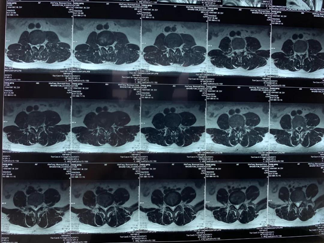 今年23歲的王先生因腰痛伴雙下肢放射痛及麻木不適2年加重5個(gè)月入院,入院后依據(jù)詳細(xì)查體和完善相關(guān)檢查,診斷為:腰椎間盤脫出癥,磁共振提示腰椎間盤巨大脫出。