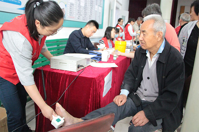 義診活動還沒正式開始,現(xiàn)場就被里三層外三層圍的水泄不通,我院內分泌代謝科及志愿者醫(yī)療服務隊免費為140余位現(xiàn)場群眾測量身高、體重、腰圍、血壓、血糖、糖化、下肢周圍神經病變等指標,聯(lián)合眼科免費篩查糖尿病視網膜病變,評估糖尿病風險、提供健康咨詢,并發(fā)放健康宣傳材料200余份?;顒蝇F(xiàn)場,我院志愿者們忙碌于于人群中間,于大娘因腿腳不方便沒法排隊查血糖,李曉靜醫(yī)生便帶著儀器來到她的旁邊,一邊講解著糖尿病患者的注意事項,一邊為她測量血糖……