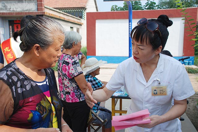 志愿者為村民發(fā)放健康資料