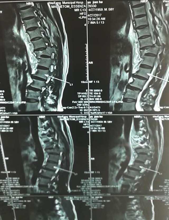 2017年5月13日上午10時左右,家住濰城區(qū)望留街辦的于先生在家中干農(nóng)活時不慎從約三米的高處墜落,腰背部受到猛烈撞擊并有明顯的變形,由于病人情況危急,我院醫(yī)護人員在急救車上便進行了有效的處理,我院急救車第一時間到達現(xiàn)場后迅速將傷者接入我院救治。病人通過急救醫(yī)學科收住我院骨科,我院骨科副主任孫守全得知患者病情后,立刻安排啟動急診綠色通道,行相關(guān)輔助檢查,追問病史,仔細閱片,并立刻組織科室人員進行病情討論。經(jīng)過系統(tǒng)的檢查,于先生被診斷為:1、T11椎體急性爆裂性骨折2、脊髓橫斷損傷(T10-11)3、T9、L3椎體壓縮骨折4、左側(cè)第6-10肋骨骨折5、T9、L3椎體壓縮骨折。因患者病情損傷嚴重,脊柱骨折伴有脫位,脊髓損傷伴嚴重受壓,經(jīng)孫主任專家團隊討論后,最終決定為該患者立即行急診手術(shù)治療,孫主任一面向家屬交代病情,一面完善術(shù)前檢查,積極術(shù)前準備,排除手術(shù)禁忌,為患者的手術(shù)分秒必爭。經(jīng)過與患者家屬充分溝通,患者家屬了解了病情以及手術(shù)的必要性,同意給于先生做手術(shù)?;颊哌M入手術(shù)室前,于先生的兒子握著孫主任的手說:“孫主任,我爹是家里的頂梁柱,是我們?nèi)胰说南M?,請您一定要治好我爹啊?rdquo;孫主任拍著小于的肩膀說:“你放心吧,我定盡我所能。”