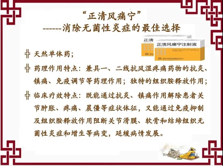 正清風(fēng)痛寧,純中藥制劑,具有消炎止痛,改善微循環(huán),輕度免疫抑制的作用,肝腎功能無毒副作用,具有療效確切、操作簡便、安全可靠等特點(diǎn)。對(duì)解除關(guān)節(jié)疼痛,改善膝關(guān)節(jié)功能,促進(jìn)關(guān)節(jié)修復(fù),正清風(fēng)痛寧三聯(lián)序貫療法,短期有非常肯定的治療效果。此療法強(qiáng)調(diào)將抗炎藥物直接注入到炎性病灶內(nèi)以消除軟組織及周圍神經(jīng)的各類慢性炎癥,即通過抗炎而達(dá)到鎮(zhèn)痛和肌松的目的,不用激素卻可解決慢性痛癥,真正解決了大多數(shù)患者的“激素恐懼”及對(duì)“封閉”的排斥問題。