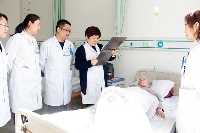 何阿姨病情漸漸穩(wěn)定后,鄭成玲大夫更加詳細(xì)地了解患者的病史,并作詳細(xì)的體格檢查,發(fā)現(xiàn)患者呈神志清,精神萎靡,查體合作,顏面部水腫,口唇及四肢末梢紫紺,桶狀胸,肋間隙增寬,雙肺呼吸音粗,雙肺聞及散在干、濕性啰音,心率92次/分,心律絕對(duì)不齊,第一心音強(qiáng)弱不等,四肢凹陷性浮腫。給予吸氧、心電監(jiān)護(hù)、持續(xù)導(dǎo)尿,診斷:1﹑肺炎2、慢性阻塞性肺病急性加重期3、呼吸衰竭4、呼吸性酸中毒5、肺性腦病6、心功能IV級(jí)。7、房顫?;颊叨喾N慢性病,日常治療不系統(tǒng),發(fā)病后未能抓緊黃金時(shí)間治療,處于心肺功能衰竭狀態(tài),病情危重,望著拿著病危通知單的家屬殷切的目光。呼吸內(nèi)科的全體人員化壓力為動(dòng)力。在綜合考慮患者個(gè)體情況后,鄭成玲大夫積極向呼吸內(nèi)科主任張言匯報(bào)病情,上級(jí)醫(yī)師每天多次查看患者,并根據(jù)患者的病情,積極展開科室內(nèi)的討論,并根據(jù)患者的病情給予個(gè)體化的治療方案,鄭成玲大夫每天不定時(shí)查房,隨時(shí)掌握患者的病情變化,不斷修整治療方案。期間患者曾三次出現(xiàn)呼吸衰竭,經(jīng)張言副主任醫(yī)師,鄭成玲醫(yī)師,劉金云護(hù)士長等多名醫(yī)護(hù)人員積極搶救,患者均轉(zhuǎn)危為安。我科護(hù)理人員每天堅(jiān)持為何阿姨翻身拍背刺激排痰,并鍛煉其呼吸功能,經(jīng)我科全體醫(yī)護(hù)人員的不懈努力,何阿姨的病情平穩(wěn),身體日漸康復(fù),經(jīng)過十余天的治療后康復(fù)出院。出院時(shí),何阿姨及家屬對(duì)呼吸內(nèi)科全體醫(yī)護(hù)人員表達(dá)了深深地謝意,對(duì)科室的醫(yī)療技術(shù)與醫(yī)療服務(wù)做出了肯定。