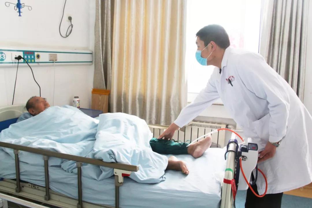 康復(fù)科醫(yī)師為骨折患者進(jìn)行下肢壓力泵治療
