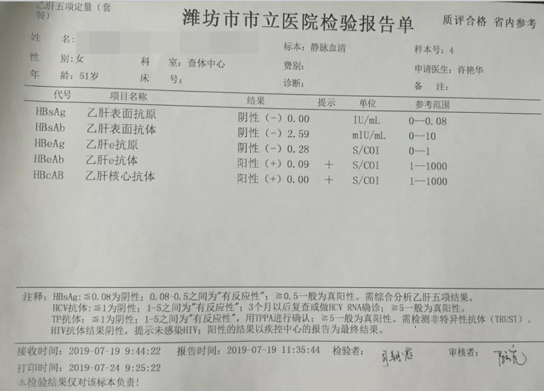2019年7月19日是慢性病查體的日子。下午三點(diǎn)多,體檢中心工作人員拿著一張“可疑”乙肝五項(xiàng)報(bào)告單找到我。朱女士,51歲,慢性病毒性肝炎,查乙肝五項(xiàng)定量和肝功。按常理來說此人是辦乙肝慢病,表面抗原應(yīng)該是陽(yáng)性,而報(bào)告上只乙肝e抗體、乙肝核心抗體陽(yáng)性。我們馬上進(jìn)行核查并復(fù)檢:先用了金標(biāo)快速檢測(cè)法是陰性,又用了酶聯(lián)免疫法復(fù)檢還是陰性;又找出檢測(cè)肝功的標(biāo)本進(jìn)行了化學(xué)發(fā)光乙肝定量檢測(cè),檢測(cè)結(jié)果與上午一致。