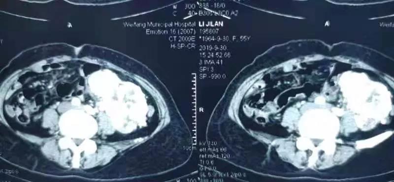 201910月,李阿姨發(fā)現(xiàn)自己腹部左側(cè)有一個“硬塊”出現(xiàn),且質(zhì)地較硬,感覺腹部出現(xiàn)了明顯不適,隨即便來到了濰坊市市立醫(yī)院就診。醫(yī)院超聲科主任田艷梅在為李阿姨進(jìn)行超聲檢查時發(fā)現(xiàn)李阿姨左腎有一個巨大的腫物,于是便通知了我院副院長、泌尿外科主任解魯明,解主任在接到了通知后趕到了B超室,經(jīng)過詳細(xì)的問診后解主任了解了李阿姨的病情,隨即建議李阿姨住院進(jìn)一步檢查治療。