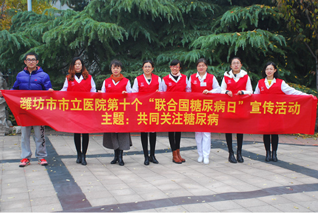 11月14日上午,為進(jìn)一步切實(shí)做好糖尿病預(yù)防工作,提高人民群眾對糖尿病的認(rèn)識,維護(hù)人民群眾的身心健康,我院醫(yī)療工作者與濰城區(qū)疾病控制中心等工作人員組成醫(yī)療志愿者服務(wù)隊(duì),走進(jìn)南關(guān)社區(qū)向陽園廣場,進(jìn)行“聯(lián)合國糖尿病日”宣傳、義診活動。