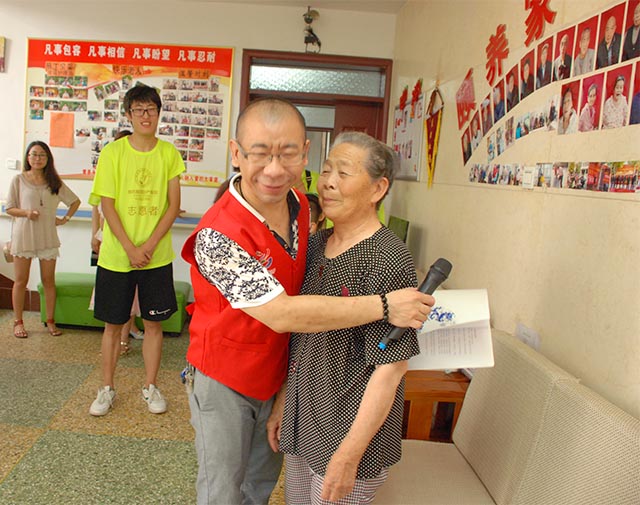 志愿者表演節(jié)目后老人稱贊節(jié)目演的好,志愿者與老人親切擁抱