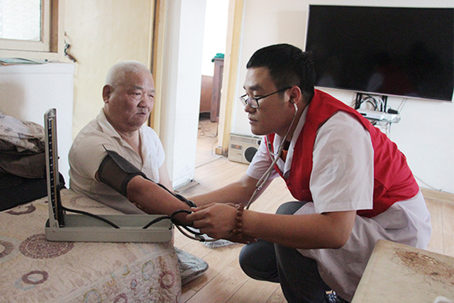 內(nèi)分泌代謝科董愛龍醫(yī)生為宋大爺測量血壓