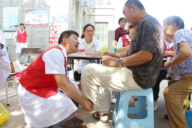 義診活動中,我院黨員專家為前來咨詢的居民進行身高、體重、血壓、血糖、視力檢查、心電圖、尿常規(guī)、大便常規(guī)、超聲檢查、糖尿病及并發(fā)癥篩查等檢查,耐心地詢問他們的身體狀況,在聽其講述自己的病癥及病情疑惑后,為他們提供專業(yè)的治療意見,并告知他們一些常見疾病的防治知識,指導居民合理膳食、規(guī)范用藥,以及日常的鍛煉及飲食建議。同時我院志愿者向過往居民發(fā)放健康知識宣傳材料,成為現(xiàn)場傳播健康知識的亮麗風景線。