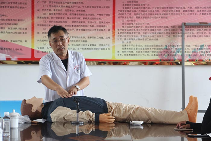 活動(dòng)中,首先由我院急救醫(yī)學(xué)科齊成華副主任醫(yī)師對(duì)中暑、狗咬傷、急救搶救知識(shí)三個(gè)方面進(jìn)行培訓(xùn)。為了讓環(huán)衛(wèi)工人更好地理解心肺復(fù)蘇知識(shí),掌握心肺復(fù)蘇技能,齊成華副主任醫(yī)師以簡(jiǎn)潔的語(yǔ)言進(jìn)行描述并通過現(xiàn)場(chǎng)人體模型進(jìn)行了心肺復(fù)蘇演示,為在座的環(huán)衛(wèi)工人上了一堂生動(dòng)的急救知識(shí)課,提升了急救技能。