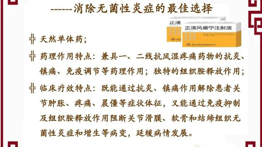 正清風(fēng)痛寧,純中藥制劑,具有消炎止痛,改善微循環(huán),輕度免疫抑制的作用,肝腎功能無毒副作用,具有療效確切、操作簡便、安全可靠等特點。對解除關(guān)節(jié)疼痛,改善膝關(guān)節(jié)功能,促進關(guān)節(jié)修復(fù),正清風(fēng)痛寧三聯(lián)序貫療法,短期有非??隙ǖ闹委熜Ч?。此療法強調(diào)將抗炎藥物直接注入到炎性病灶內(nèi)以消除軟組織及周圍神經(jīng)的各類慢性炎癥,即通過抗炎而達到鎮(zhèn)痛和肌松的目的,不用激素卻可解決慢性痛癥,真正解決了大多數(shù)患者的“激素恐懼”及對“封閉”的排斥問題。