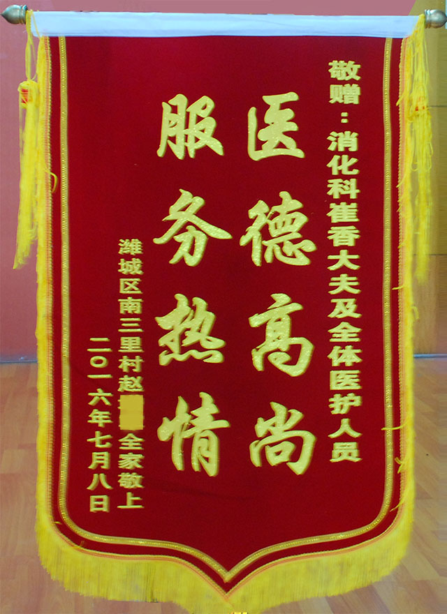 7月8日上午,濰城區(qū)南三里村趙先生給消化內(nèi)科送來一面錦旗,上面寫“敬贈:消化科崔香大夫及全體醫(yī)護人員 醫(yī)德高尚 服務熱情”。