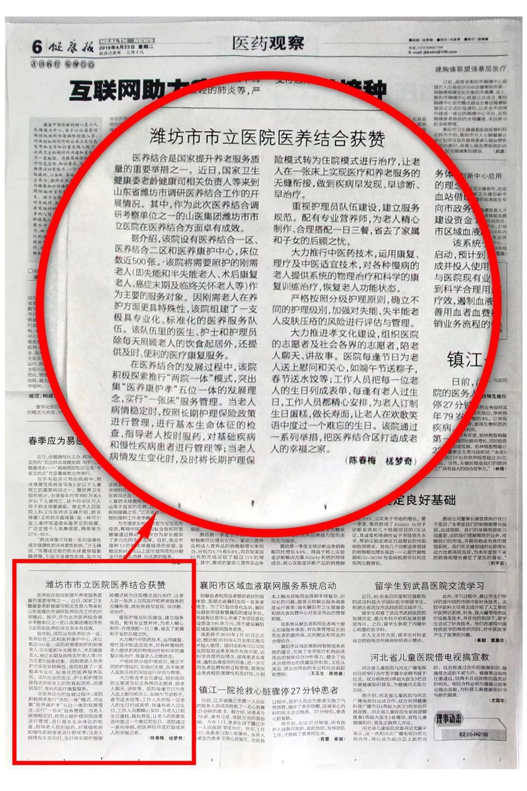 2019年423日,《健康報(bào)》第六版醫(yī)藥觀察專欄,刊登了我院醫(yī)養(yǎng)結(jié)合文章《濰坊市市立醫(yī)院醫(yī)養(yǎng)結(jié)合獲贊》,文章從我院積極探索“兩院一體”運(yùn)營(yíng)模式、“一張床”服務(wù)管理、“醫(yī)、養(yǎng)、康、護(hù)、孝”五位一體發(fā)展理念的工作模式,以及醫(yī)療救治、養(yǎng)老服務(wù)、康復(fù)理療、分級(jí)護(hù)理、孝文化建設(shè)等方面來展現(xiàn)我院醫(yī)養(yǎng)結(jié)合工作發(fā)展,我院經(jīng)過多年多地探索實(shí)踐,在醫(yī)養(yǎng)結(jié)合工作領(lǐng)域積累了豐富的經(jīng)驗(yàn),受到了政府及社會(huì)各界的大力支持和肯定,在醫(yī)養(yǎng)結(jié)合行業(yè)起到了輻射和引領(lǐng)作用,形成了品牌效應(yīng)。
