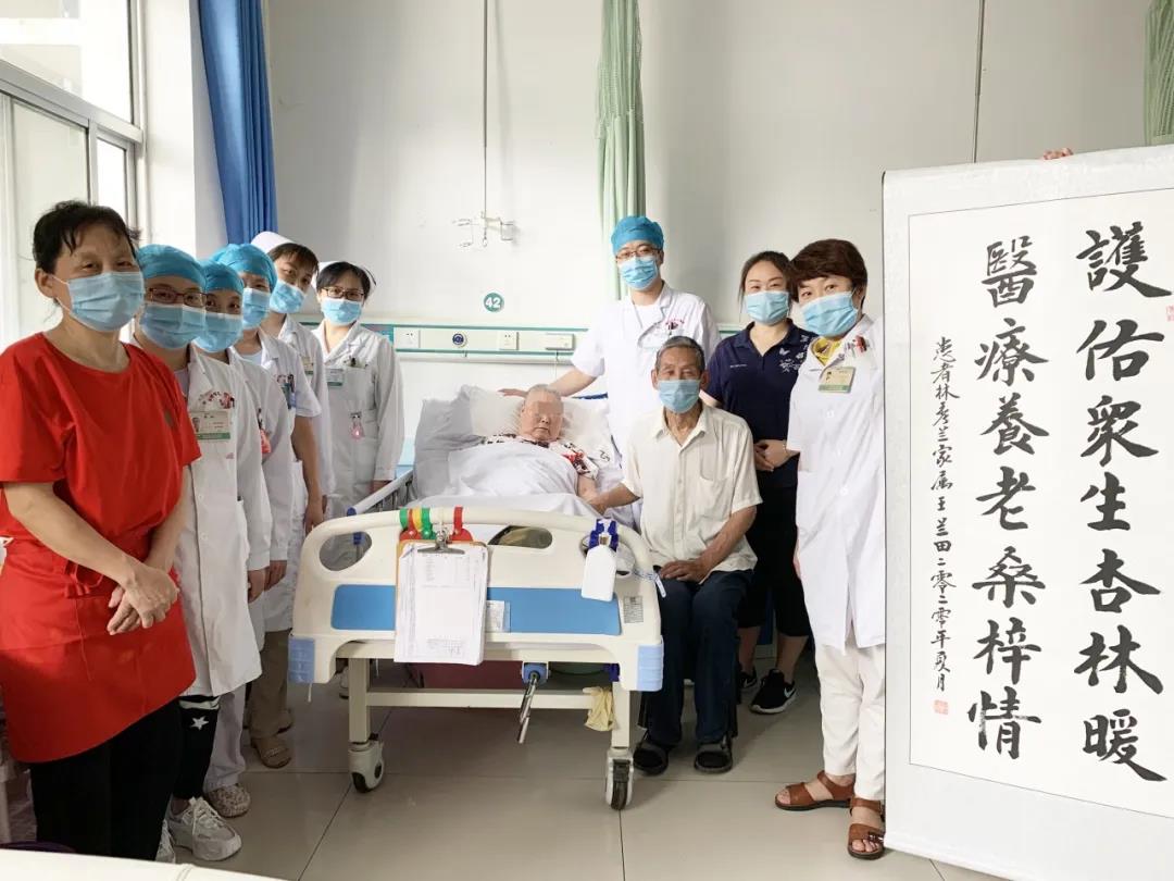 2019年12月,林大姨的老伴王大爺就滿懷激動地寫了感謝信送到了科室,以表達對醫(yī)養(yǎng)結合一病區(qū)全體醫(yī)護人員的感謝。2020年7月10日上午,王大爺又送來了裝裱好的書法“護佑眾生杏林暖,醫(yī)療養(yǎng)老桑梓情”來表達感激之情。這是王大爺幾經斟酌寫的作品,充分表現了醫(yī)養(yǎng)結合對疾病纏身、長期臥床老人的重要性。杏林很多人都知道是中醫(yī)學界的代稱,現在也泛指整個醫(yī)學界,那么桑梓是什么意思呢?為什么會用“桑梓”來對“杏林”?《詩經.小雅》:“維桑與梓,必恭敬之。”是說家鄉(xiāng)的桑樹和梓樹是父母種的,對它要表示敬意,后人用“桑梓”借指故鄉(xiāng),離鄉(xiāng)的人在外地看到桑梓樹時就會懷戀自己的家鄉(xiāng),王大爺已經把醫(yī)養(yǎng)結合一病區(qū)當成自己的故鄉(xiāng)了,寓意在這里既能享受醫(yī)療還能養(yǎng)老,盡享天倫之樂,真正是做到落葉歸根了,同時也表達了對市立醫(yī)院乃至整個醫(yī)學界的敬意!