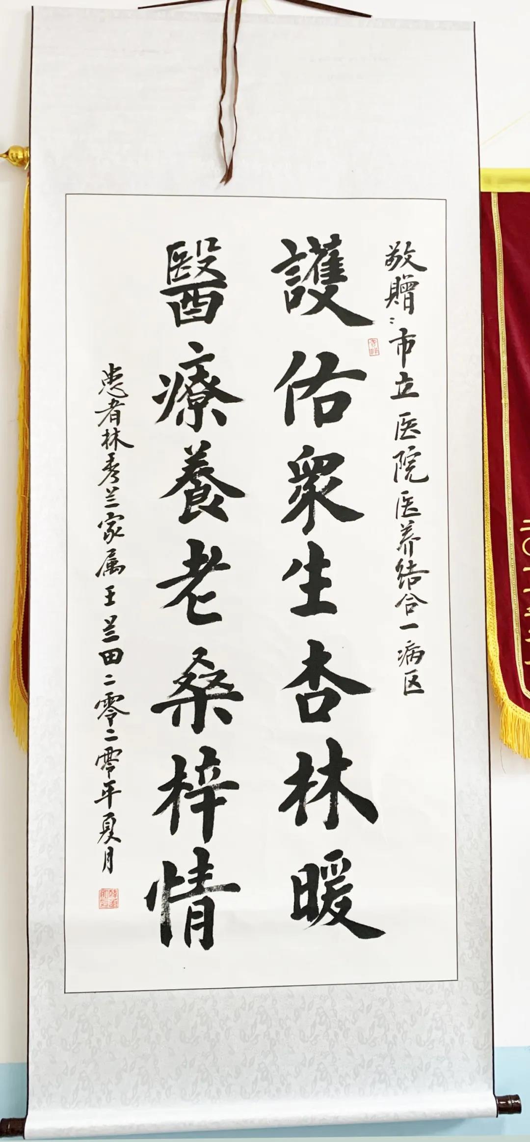“老伴在咱們這里住著我非常放心,感謝你們對她的照顧與幫助,我代表我們全家人向你們說一聲謝謝了……”7月10日,王大爺將一幅滿懷感激之情的書法作品送到醫(yī)養(yǎng)結合一病區(qū)。