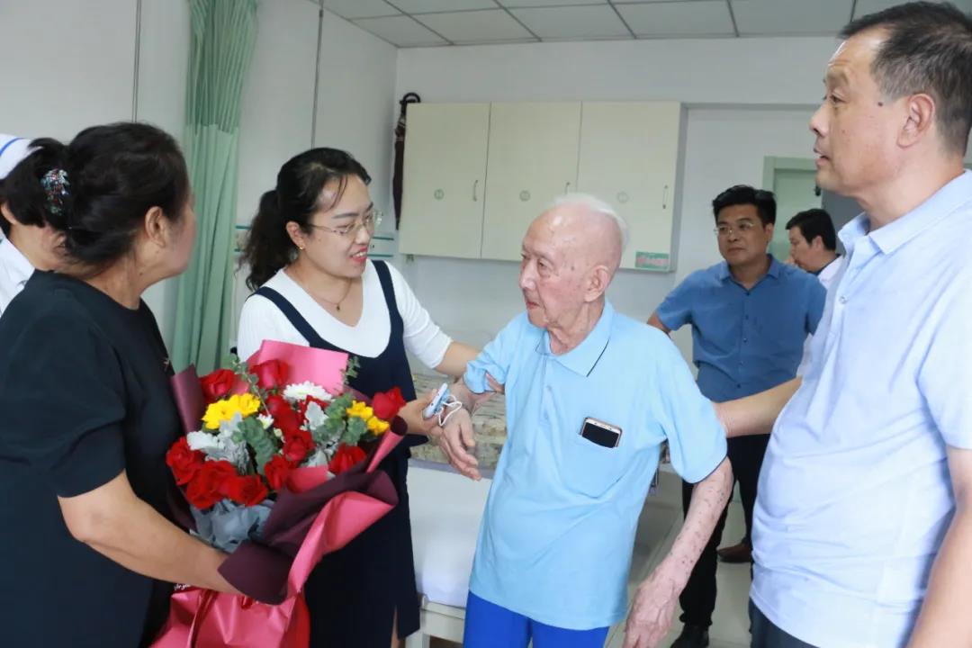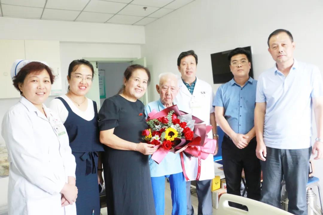 在紀(jì)念中國人民抗日戰(zhàn)爭暨世界反法西斯戰(zhàn)爭勝利75周年之際,9月4日,醫(yī)院黨委副書記王曉晨、院長助理韓佳君、院辦主任何順堂走進(jìn)醫(yī)院神經(jīng)內(nèi)科病房慰問抗戰(zhàn)時(shí)期參加革命工作的離休干部張?jiān)鲋?,向他致以親切的問候并送上慰問品和鮮花。