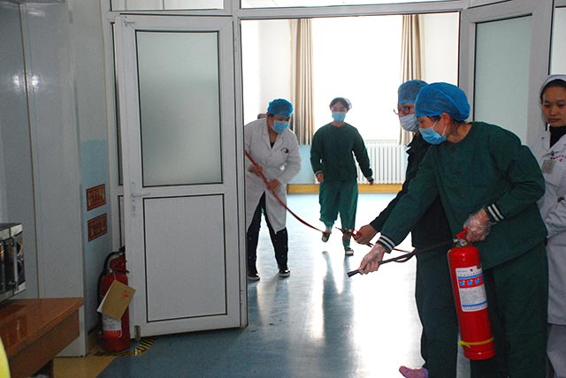 “跌倒/墜床”應(yīng)急演練結(jié)束后,全院護(hù)士長(zhǎng)及護(hù)理骨干來(lái)到重癥醫(yī)學(xué)科開(kāi)展火災(zāi)消防演練。首先,由周志慧護(hù)士長(zhǎng)簡(jiǎn)單講解了演練過(guò)程中需要注意的問(wèn)題及演練流程,演練正式開(kāi)始。當(dāng)接到監(jiān)護(hù)室微波爐起火的報(bào)告,所有在班醫(yī)務(wù)人員有序的按照消防流程開(kāi)始,負(fù)責(zé)滅火的迅速拿起滅火器滅初期小火,見(jiàn)火勢(shì)未得到控制,另外兩人迅速鋪開(kāi)滅火水龍帶進(jìn)行滅火。辦公桌前工作的人員立即拿起電話通知醫(yī)院保衛(wèi)科,醫(yī)院總值班室,當(dāng)收到火勢(shì)沒(méi)有得到有效控制的通知時(shí),立即撥打119火災(zāi)電話報(bào)警。同時(shí)立即開(kāi)放安全通道,將科室總電源開(kāi)關(guān)關(guān)閉,三名工作人員迅速攜帶簡(jiǎn)易呼吸器來(lái)到一名危重患者的床旁,收拾監(jiān)護(hù)儀,拔掉氣墊床,保護(hù)好液體通道,將濕透的紗布覆蓋在病人口鼻部,迅速將其轉(zhuǎn)運(yùn)至安全場(chǎng)所后,又在做好自我防護(hù)的前提下,返回火災(zāi)現(xiàn)場(chǎng),將呼吸機(jī),除顫儀等貴重醫(yī)療設(shè)備轉(zhuǎn)運(yùn)出火災(zāi)現(xiàn)場(chǎng)。同時(shí),另一人員將科室存放的易燃易爆如酒精等物品迅速經(jīng)員工通道轉(zhuǎn)運(yùn)出科室。最終,在三名滅火人員的努力下,火勢(shì)得到控制,警報(bào)解除。護(hù)理部孫春梅主任在演練結(jié)束后,再次強(qiáng)調(diào)消防意識(shí)的重要性,同時(shí)給大家詳細(xì)講解滅火器及滅火水龍頭的使用方法及注意事項(xiàng),她表示,學(xué)習(xí)消防知識(shí),排除安全隱患,防微杜漸,防患于未然是最重要的。