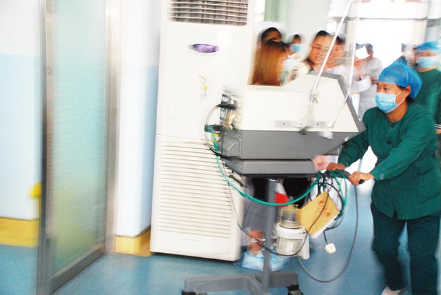 火災(zāi)應(yīng)急演練中,護(hù)理人員將呼吸機(jī),除顫儀等貴重醫(yī)療設(shè)備迅速轉(zhuǎn)運(yùn)