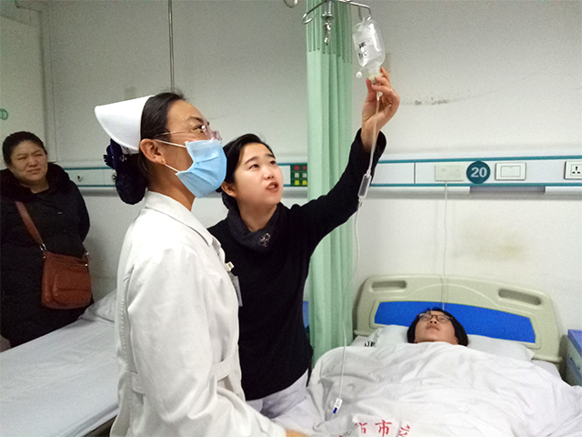 首先,病人家屬(董春雨扮演)發(fā)現(xiàn)了輸液瓶內(nèi)有異物,隨即呼叫護(hù)士(劉春燕扮演),更換輸液瓶及輸液器,病人家屬搶奪下輸液瓶,要求對液體進(jìn)行鑒定檢驗(yàn),看是否對身體造成影響。