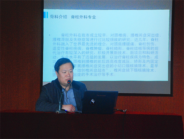“我院骨科始建于上世紀(jì)九十年代,自創(chuàng)立至今,經(jīng)過二十幾年不懈的探索和努力,已經(jīng)發(fā)展成為一個(gè)專業(yè)齊全,涵蓋手外科、顯微外科,脊柱外科,關(guān)節(jié)外科,創(chuàng)傷外科四個(gè)專業(yè)的大型科室,是我院重點(diǎn)專科發(fā)展科室。”講座中,孫主任就骨科的科室發(fā)展史、骨科現(xiàn)在狀況以及骨科專業(yè)進(jìn)行了全面系統(tǒng)的介紹。