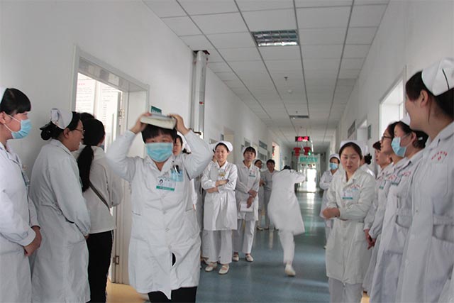 在消化內(nèi)科病房,上演的是地震時人員的撤離以及醫(yī)療護理工作的順利開展。下午三點,科室成員正在正常工作,突然發(fā)現(xiàn)桌椅及水杯等出現(xiàn)晃動,李玲護士長喊話:地震了,大家趕緊躲避!科室醫(yī)護人員果斷做出判斷,科室人員及患者、家屬以最快的速度拿起枕頭,書本等頂?shù)筋^上,安排行動不便的患者盡量靠墻角位置蹲下,并將無法行動的患者用被套包裹轉運到安全區(qū)域,撤離工作緊張而有序的開展,未落下一名病人。