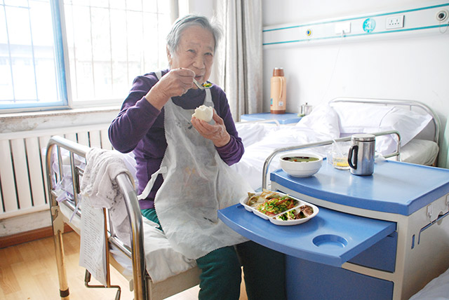 濰坊市市立醫(yī)院醫(yī)養(yǎng)結(jié)合病區(qū)收治的病人多數(shù)為生活不能自理的失能、半失能老人,這些老人由于各種原因?qū)е律眢w機(jī)能較差,需要專業(yè)的醫(yī)療護(hù)理和精心的日常生活照料,飲食更需要特別注意。病區(qū)內(nèi)專門配有專業(yè)營養(yǎng)師,根據(jù)老人疾病表現(xiàn)、飲食習(xí)慣和季節(jié)變化,為老人精心制作、合理搭配一日三餐,做到一周菜品不重樣,主食有粗有細(xì),菜肴葷素搭配,營養(yǎng)合理,對臥床、患病老人,根據(jù)醫(yī)囑安排伙食,并送餐到床頭。對于身體健康的老人,提供營養(yǎng)普通飲食;對于身體健康但咀嚼有困難的老人,提供軟飯;對于咀嚼吞咽有困難的老人,提供半流質(zhì)飲食;對于吞咽困難和輔助搭配吸收不好的老人,提供和輔助搭配勻漿膳、要素膳;對于不能吞咽的老人,用鼻飼飲食的方法導(dǎo)入勻漿膳和要素膳。餐具、鼻飼管定期消毒更換,不能自理者則一勺一勺地喂,掌握喂食節(jié)奏和食物的軟硬冷熱。通過為患者提供營養(yǎng)均衡、衛(wèi)生的膳食服務(wù)外,還配合臨床醫(yī)生的工作,為患者提供適當(dāng)?shù)臓I養(yǎng)治療:如對冠心病、高血壓和腎病患者,嘗試低鹽飲食、無鹽飲食;對于痛風(fēng)、腎病、膽囊炎患者,嘗試高纖維膳食、低嘌呤膳食、低脂膳食;對貧血老人,添加補(bǔ)血的營養(yǎng)湯羹;結(jié)合季節(jié)特點(diǎn),推行符合季節(jié)保健要求的藥膳,春夏以菜品為主,秋冬以湯粥為主,使肌體營養(yǎng)達(dá)到平衡,實(shí)現(xiàn)合理的營養(yǎng)和科學(xué)的膳食,提高老人身體的抵抗力和免疫力。