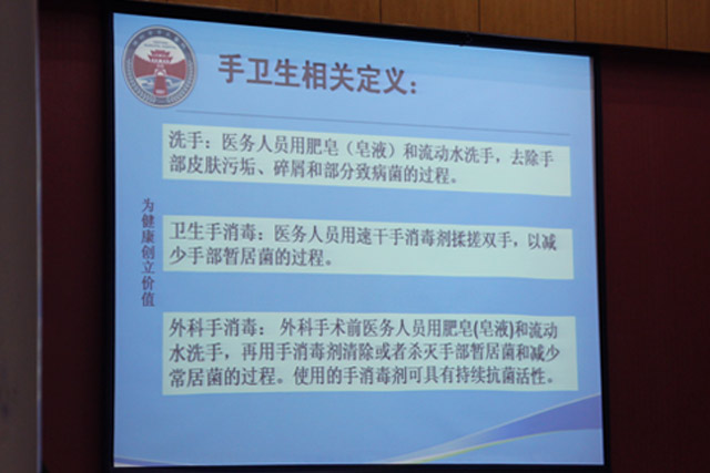 培訓(xùn)結(jié)束后,劉長愛副主任現(xiàn)場示范了正確的洗手方法,“內(nèi)”“外”“夾”“弓”“大”“立”6個步驟進(jìn)行揉搓,對直接接觸患者的感染部位、血液、體液、分泌物、排泄物、傷口等,穿脫隔離衣前后,進(jìn)行無菌操作前,處理藥物等幾個洗手指征進(jìn)行了講解。