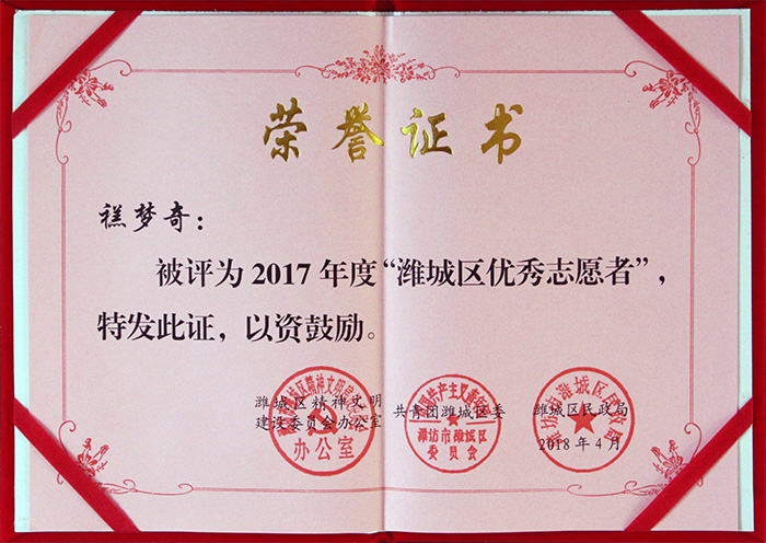 為大力弘揚"奉獻、友愛、互助、進步"的志愿服務(wù)精神,充分發(fā)揮先進典型示范引領(lǐng)作用,2018年4月,濰城區(qū)文明辦、共青團濰城區(qū)委、濰城區(qū)民政頒發(fā)《關(guān)于表彰2017年度濰城區(qū)"優(yōu)秀志愿服務(wù)社區(qū)""優(yōu)秀志愿服務(wù)組織""和"優(yōu)秀志愿者"的決定》,其中,我院榮獲濰城區(qū)"優(yōu)秀志愿服務(wù)組織",志愿者禚夢奇被評為濰城區(qū)"優(yōu)秀志愿者"。