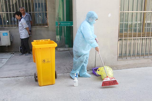 總務科通知運保潔員穿戴好防護用品、帶好含氯消毒劑、水桶、拖把對現(xiàn)場進行消毒,并重新收集、整理散落的醫(yī)療廢物,重新封口、貼標簽,轉(zhuǎn)運至醫(yī)療廢物暫存地。