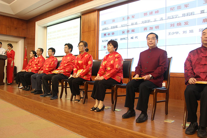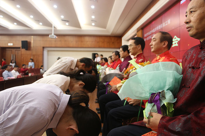 在會議中,與會人員集體誦讀了大醫(yī)精誠,來自全市各醫(yī)院的200余名跟師人員分批次進行了隆重的拜師儀式,指導(dǎo)老師們身著唐裝,彰顯大師風(fēng)范;跟師人員身穿白襯衣,虔誠崇敬。通過呈送拜師帖、回徒帖、導(dǎo)師寄語、跟師人員宣誓等拜師傳統(tǒng),再現(xiàn)中醫(yī)導(dǎo)師對跟師人員言傳身教,傳道、授業(yè)、解惑的莊重儀式。
