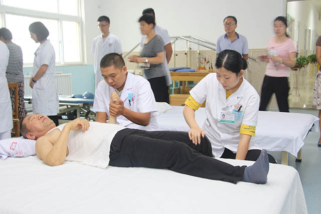 參觀考察組首先在醫(yī)院大廳觀看了我院醫(yī)養(yǎng)結(jié)合宣傳短片及根據(jù)我院醫(yī)養(yǎng)結(jié)合區(qū)題材自編、自導(dǎo)、自演的微電影《堅(jiān)守》。隨后參觀了我院醫(yī)養(yǎng)結(jié)合一區(qū)及康復(fù)大廳,實(shí)地查看了醫(yī)養(yǎng)結(jié)合區(qū)內(nèi)外部環(huán)境、陣地建設(shè)、硬件配備等相關(guān)情況,仔細(xì)聽(tīng)取了我院關(guān)于醫(yī)養(yǎng)結(jié)合建設(shè)的解說(shuō),詳細(xì)詢(xún)問(wèn)了居住老人的醫(yī)療護(hù)理、生活照料、收費(fèi)及飲食情況,并就醫(yī)養(yǎng)結(jié)合工作的發(fā)展趨勢(shì)、機(jī)構(gòu)管理、政策銜接等方面進(jìn)行了深入探討。