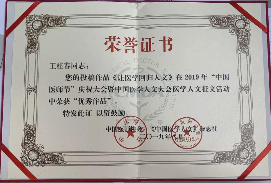 為弘揚“敬佑生命 救死扶傷 甘于奉獻 大愛無疆”的醫(yī)學(xué)人文精神,傳遞行業(yè)正能量,推進健康中國建設(shè)。近日,由中國醫(yī)師協(xié)會、中國醫(yī)師協(xié)會人文醫(yī)學(xué)專委會、白求恩精神研究會、《中國醫(yī)學(xué)人文》雜志社共同主辦的2019年“中國醫(yī)師節(jié)”慶祝大會暨中國醫(yī)學(xué)人文大會醫(yī)學(xué)人文征文活動中,我院宣傳部王桂春投稿作品《讓醫(yī)學(xué)回歸人文》榮獲“優(yōu)秀作品”獎。