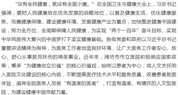 人文精神是醫(yī)學(xué)精神的核心價值所在,沒有人文精神,醫(yī)學(xué)就失去了靈魂;尊重和踐行人文精神,是當(dāng)今時代大衛(wèi)生、大健康觀念的重要體現(xiàn)。濰坊市市立醫(yī)院,注重人文精神在醫(yī)療服務(wù)中的體現(xiàn),發(fā)揮人文、社會、心理對人的健康干預(yù)和健康支撐的重要作用,一切以患者為核心,高舉人文精神的大旗,在建設(shè)健康中國的道路上,大步向前!
