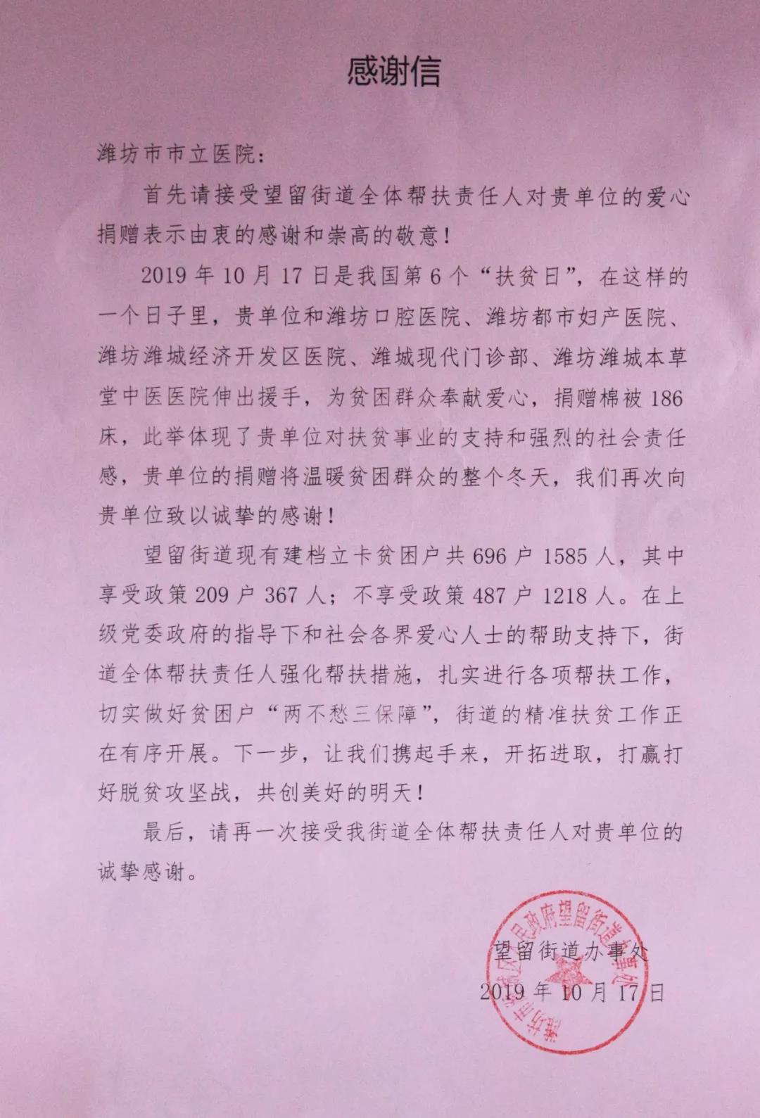 2019年1017日是我國(guó)第6個(gè)“扶貧日”。為引導(dǎo)社會(huì)各界關(guān)愛貧困人口、關(guān)心支持扶貧工作,營(yíng)造全社會(huì)參與扶貧開發(fā)的良好氛圍,1017日上午,濰城區(qū)舉行扶貧日社會(huì)辦醫(yī)機(jī)構(gòu)捐贈(zèng)儀式。濰城區(qū)衛(wèi)健局、望留街道辦事處等單位領(lǐng)導(dǎo),各社會(huì)辦醫(yī)機(jī)構(gòu)、新聞媒體等參加了此次捐贈(zèng)儀式。其中,我院作為愛心單位參加了本次活動(dòng)。