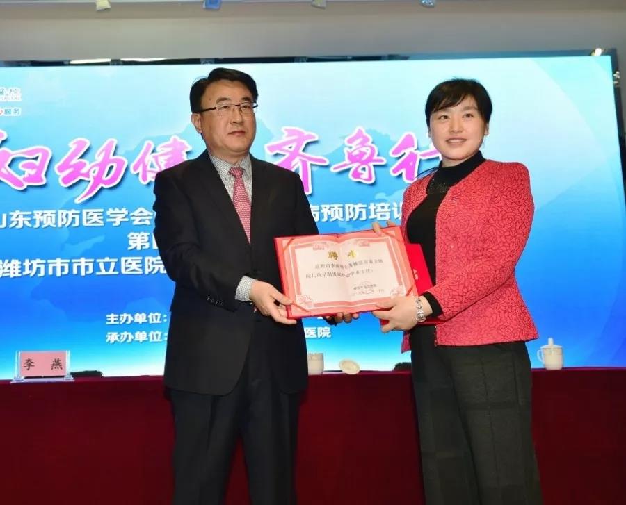 山醫(yī)集團(tuán)副主席、濰坊市市立醫(yī)院院長靳清漢為山東第一醫(yī)科大學(xué)第一附屬醫(yī)院兒保中心主任李燕博士頒發(fā)濰坊市市立醫(yī)院兒童早期發(fā)展中心首席顧問、學(xué)術(shù)主任的聘書。