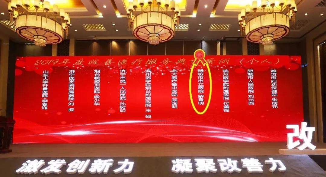 近日,由國(guó)家衛(wèi)生健康委醫(yī)政醫(yī)管局和健康報(bào)社舉辦的“2019年度改善醫(yī)療服務(wù)典型經(jīng)驗(yàn)交流推廣會(huì)”在北京隆重舉行,大會(huì)主題為“激發(fā)創(chuàng)新力 凝聚改善力”,會(huì)議對(duì)2019年度改善醫(yī)療服務(wù)十大亮點(diǎn)單位,2019年度改善醫(yī)療服務(wù)典型案例、科室、個(gè)人進(jìn)行了表彰,其中濰坊市市立醫(yī)院榮獲“2019年度改善醫(yī)療服務(wù)典型案例”先進(jìn)醫(yī)院稱號(hào),心血管科榮獲“2019年度改善醫(yī)療服務(wù)典型案例”先進(jìn)科室稱號(hào),副院長(zhǎng)、微創(chuàng)手術(shù)中心首席專家、外科主任兼泌尿外科主任解魯明主任醫(yī)師榮獲“2019年度改善醫(yī)療服務(wù)典型案例”先進(jìn)個(gè)人稱號(hào),山醫(yī)集團(tuán)副主席、濰坊市市立醫(yī)院院長(zhǎng)靳清漢,副院長(zhǎng)解魯明,心內(nèi)科主任王孝順參加了此次大會(huì)。