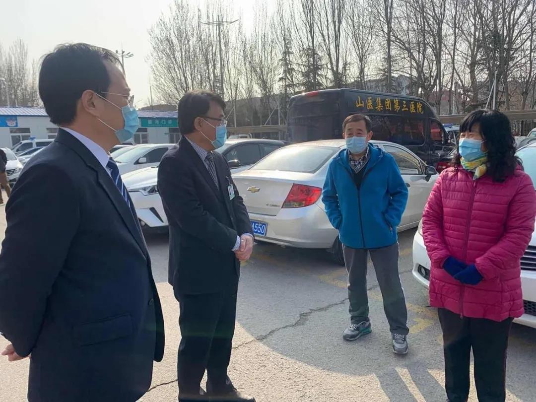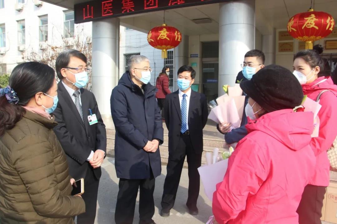 山醫(yī)集團副主席、濰坊市市立醫(yī)院院長靳清漢,山醫(yī)集團副主席、濰坊市市立醫(yī)院副院長李德明慰問援鄂醫(yī)療隊員家屬