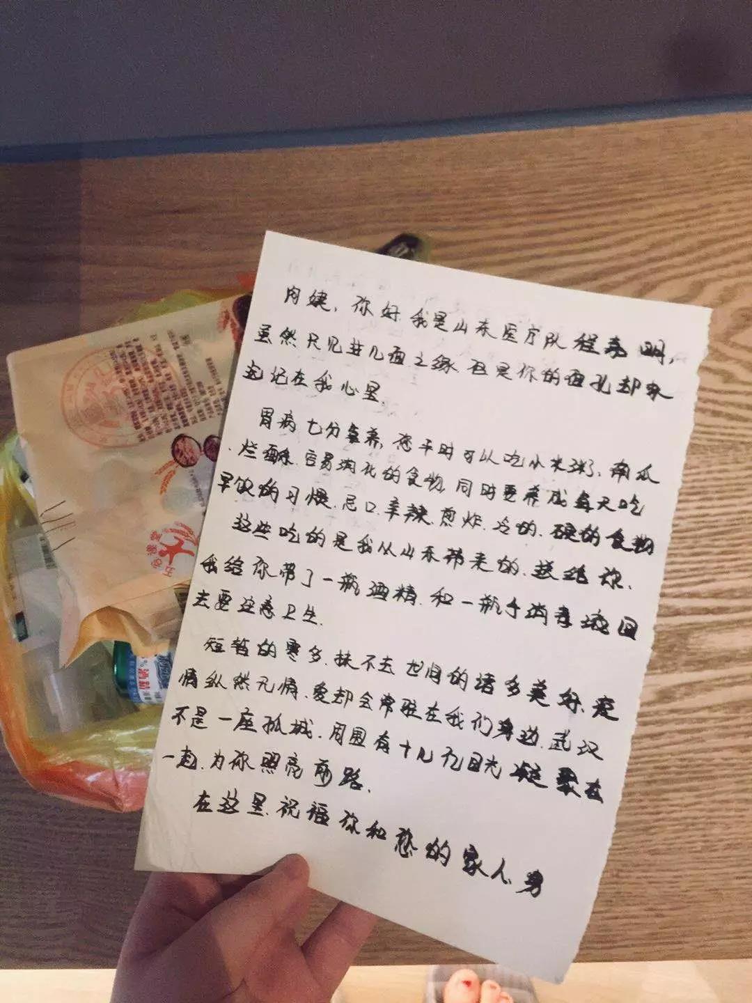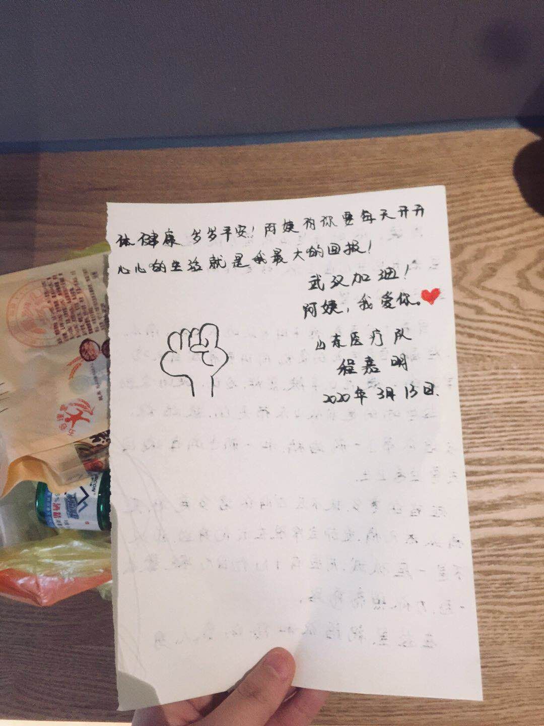 阿姨,你好。我是山東醫(yī)療隊程嘉明,雖然只有幾面之緣,但是你的面孔永遠(yuǎn)記在我的心里。