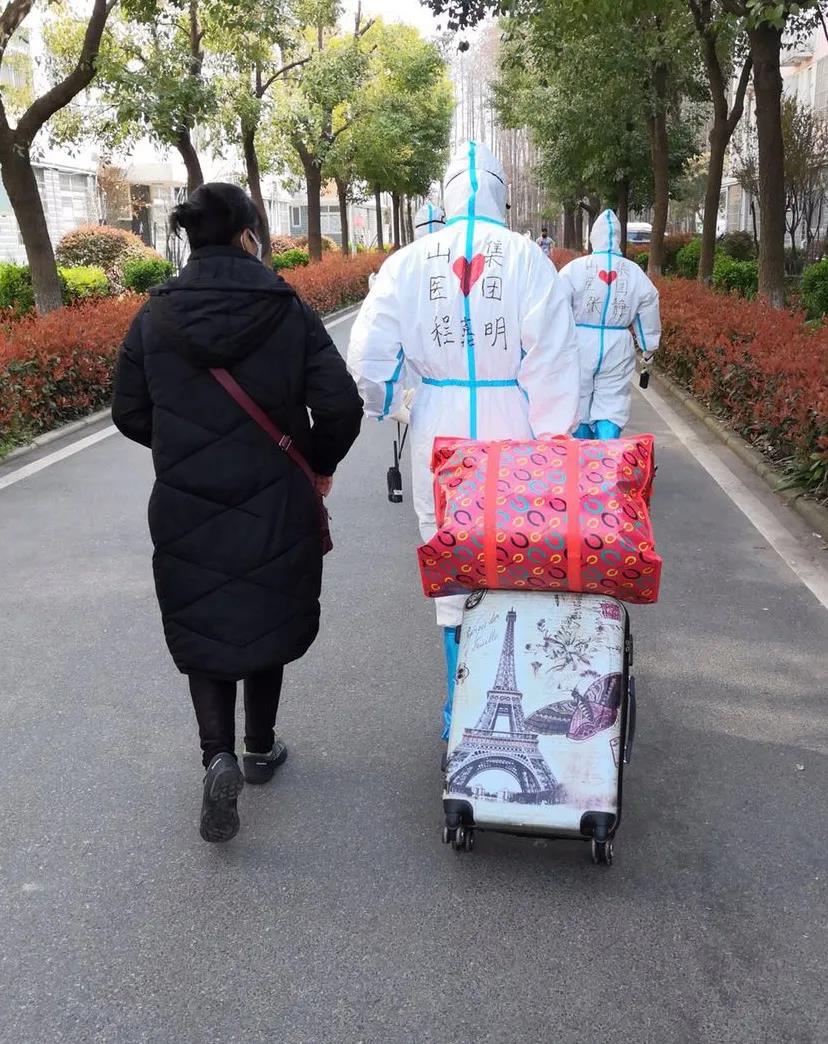 李阿姨在離開醫(yī)療點回家時,程嘉明將自己從山東帶來的酒精、手消毒液、零食以及一封充滿愛的信件送給了李阿姨,兩個人建立起了深厚的感情,回家時李阿姨笑的是那樣燦爛。