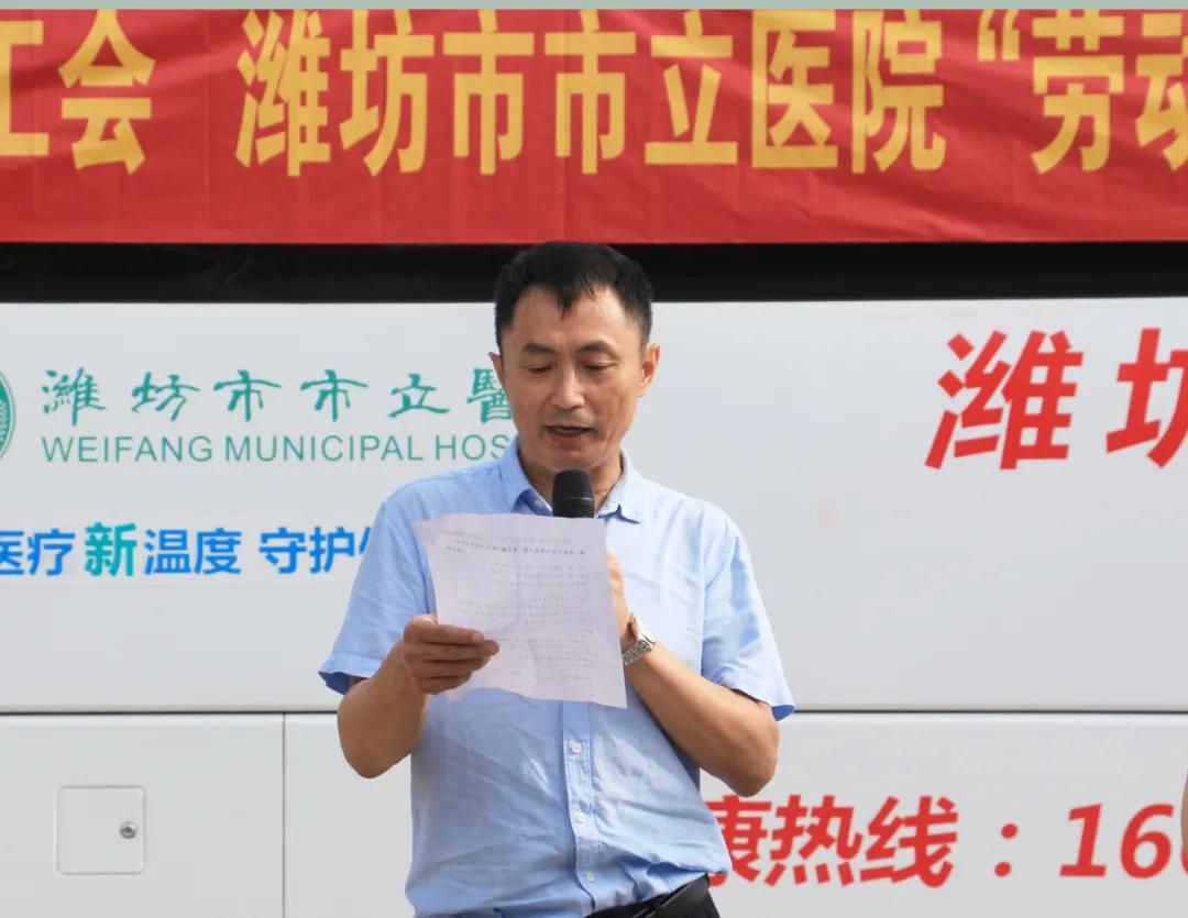 濰坊市市立醫(yī)院院長助理、醫(yī)教科主任劉偉向奮戰(zhàn)在生產(chǎn)一線的工友們表示親切的慰問,她講到:在濰城區(qū)總工會的大力支持和倡導(dǎo)下,濰坊市市立醫(yī)院流動醫(yī)院開進(jìn)了濰坊中興機(jī)械有限公司廠區(qū),將健康知識、醫(yī)療服務(wù)送到廠子里,讓職工和家屬足不出戶就能享受到專業(yè)體檢服務(wù)。“勞動最光榮 健康快樂行”職工免費(fèi)健康體檢系列活動以全區(qū)企事業(yè)單位一線職工為主要對象,開啟了醫(yī)院醫(yī)療服務(wù)新的領(lǐng)域,也是我們創(chuàng)建人文、微創(chuàng)、無痛、政府放心、群眾滿意醫(yī)院的有力舉措。希望各位朋友在享受健康體檢服務(wù)的同時,多多給醫(yī)院提出寶貴意見,讓我們更好的為老百姓服好務(wù)。