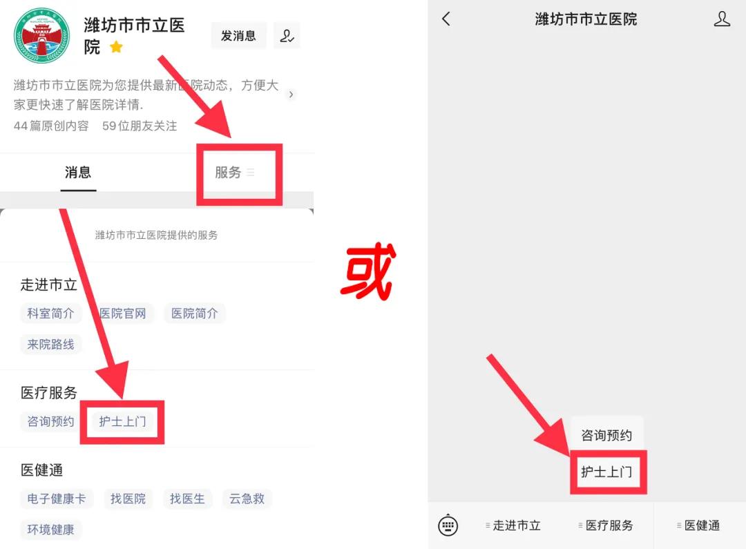 微信掃描上方二維碼,跳轉(zhuǎn)到【濰坊市市立醫(yī)院護理服務(wù)中心】小程序,選擇服務(wù)項目根據(jù)提示輕松預(yù)約護士上門服務(wù)。