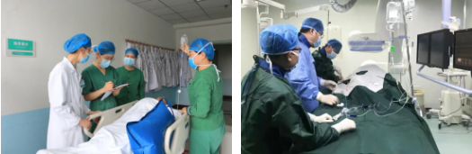 手術(shù)室相關(guān)介入人員即刻全部到位,備好搶救儀器及藥品,急診科與手術(shù)室人員完成病情交接,“患者”迅速進入介入導管手術(shù)室立即行心血管造影。
