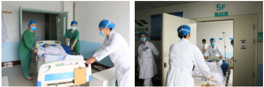 “患者”病情仍不穩(wěn)定,情況緊急,需立即進行心血管造影備支架植入,急診科立即電話通知手術(shù)室準備,開通綠色通道,“患者”由擔架車轉(zhuǎn)移至手術(shù)室。