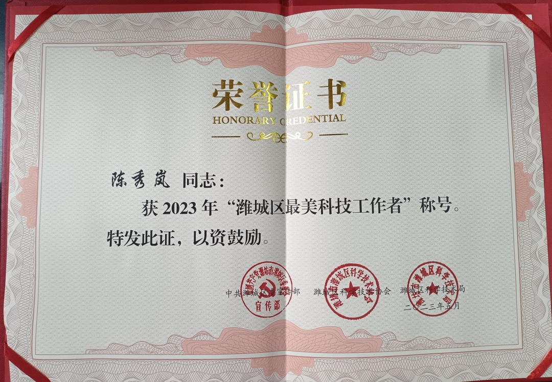 同時(shí),在區(qū)委宣傳部、區(qū)科協(xié)、區(qū)科技局共同組織開(kāi)展的2023年“濰城區(qū)最美科技工作者”選樹(shù)宣傳活動(dòng)中,陳秀嵐主任憑借崗位上的突出貢獻(xiàn)和過(guò)硬的品德修養(yǎng),當(dāng)選為“濰城區(qū)最美科技工作者”。