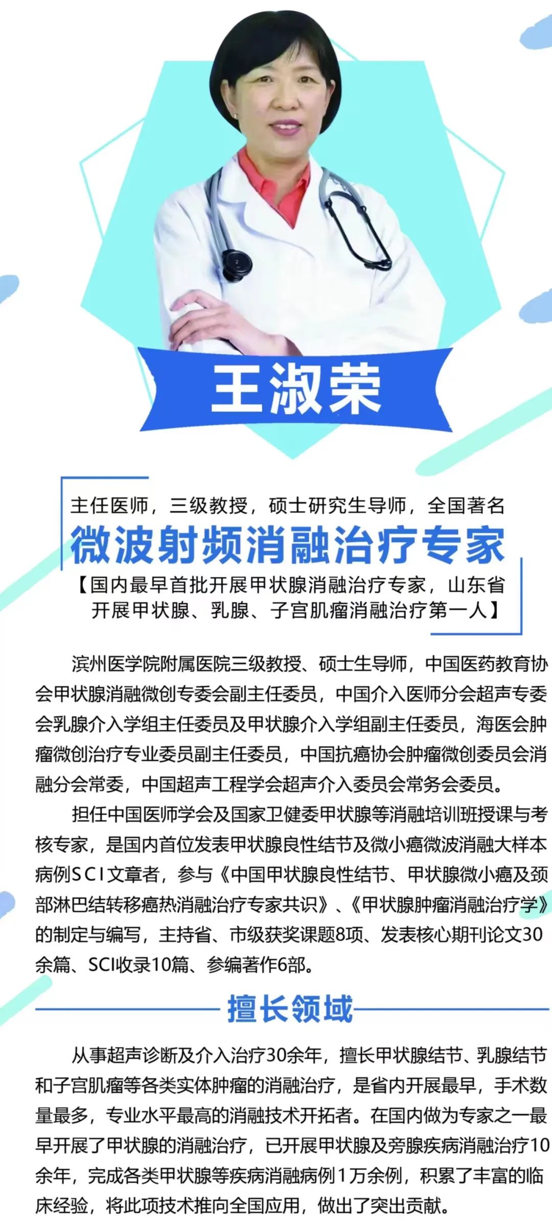 在成人腹部,心臟,婦科,胎兒,小器官,血管,四維彩超等超聲影像診斷方面積累了豐富的臨床經(jīng)驗(yàn),尤其擅長(zhǎng)心血管疾病及胎兒畸形篩查,超聲引導(dǎo)穿刺定位,超聲術(shù)中引導(dǎo)等超聲技術(shù),參編著書(shū)2部,國(guó)家期刊發(fā)表論文2篇??剖抑匾暼瞬排囵B(yǎng),先后選派業(yè)務(wù)骨干多次到北京解放軍301醫(yī)院、山東省影像研究所及山東第一醫(yī)科大學(xué)附屬第一醫(yī)院等醫(yī)院進(jìn)修學(xué)習(xí),超聲診斷技術(shù)水平不斷提高。