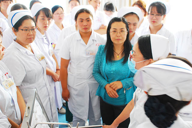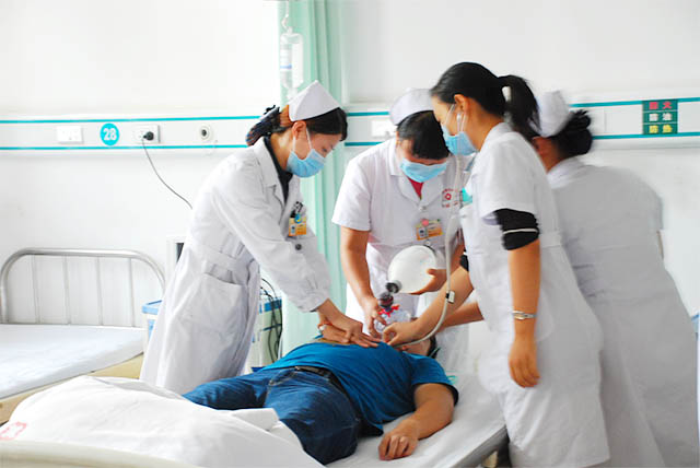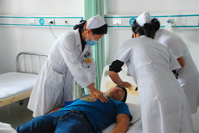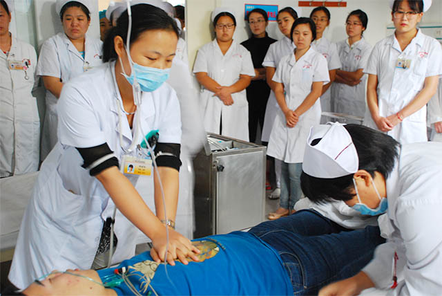 呼吸內(nèi)科首當(dāng)其沖,于九月二十三號組織患者猝死的應(yīng)急預(yù)案演練,隨著護(hù)士長王金葉“開始”的宣布,一場緊張、有條不紊的演練開始了。護(hù)士金麗寧在巡視病房時(shí),三十床家屬忽然告知三十床病人呼叫不應(yīng)答、忽然反應(yīng)無意識,金麗寧立即趕到,經(jīng)過初步判斷,病人猝死!金麗寧立即呼叫當(dāng)班鄭醫(yī)生,呼叫其他護(hù)士,然后立即地把病床拖后,給病人去枕仰臥,解開病人上衣,先行給病人心肺復(fù)蘇,此時(shí)鄭醫(yī)生趕來進(jìn)行聽診和判斷,另一名護(hù)士韓梅和吳愛華推著搶救車迅速趕來進(jìn)行搶救,吳愛華立即清理呼吸道,用簡易呼吸面罩給氧氣吸入。韓梅立即建立靜脈通道,“靜脈注射鹽酸腎上腺素1mg”,鄭醫(yī)生一邊心臟按壓一邊下達(dá)口頭醫(yī)囑,金麗寧一邊復(fù)述一邊操作,一分鐘過后,“再次靜脈注射腎上腺素1mg”,“靜脈注射尼克剎米0.375mg”,韓梅一邊準(zhǔn)備藥物一邊記錄,此刻,另一名當(dāng)班的護(hù)士轉(zhuǎn)移了臨床的病人。五分鐘初級生命支持成功后,演練結(jié)束。整個(gè)演練過程銜接緊密,參加醫(yī)生護(hù)士忙而不亂,沉著鎮(zhèn)定。演練結(jié)束后,參加觀摩演練的周志慧護(hù)士長給予了精彩的點(diǎn)評,找出演練中不足的細(xì)節(jié),例如在操作中的規(guī)范動作,在用藥過程用使用三通以便更好更快的爭分多秒等等。