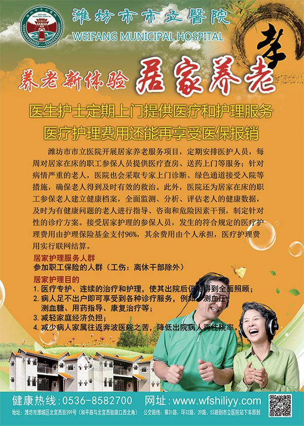 養(yǎng)老新體驗(yàn)—居家養(yǎng)老 醫(yī)生護(hù)士定期上門提供醫(yī)療和護(hù)理服務(wù) 醫(yī)療護(hù)理費(fèi)用還能再享受醫(yī)保報(bào)銷   濰坊市市立醫(yī)院開展居家養(yǎng)老服務(wù)項(xiàng)目,定期安排醫(yī)護(hù)人員,每周對(duì)居家在床的職工參保人員提供醫(yī)療查房、送藥上門等服務(wù);針對(duì)病情嚴(yán)重的老人,醫(yī)院也會(huì)采取專家上門診斷、綠色通道接受入院等措施,確保老人得到及時(shí)有效的救治。此外,醫(yī)院還為居家在床的職工參保老