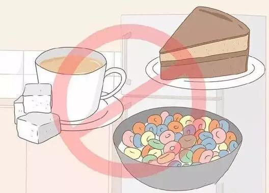要少吃的食物包括:甜點,如糖果,糕點,冰淇淋,蛋糕,巧克力或粘性糖果,含糖早餐,含糖的茶,咖啡和蘇打水……